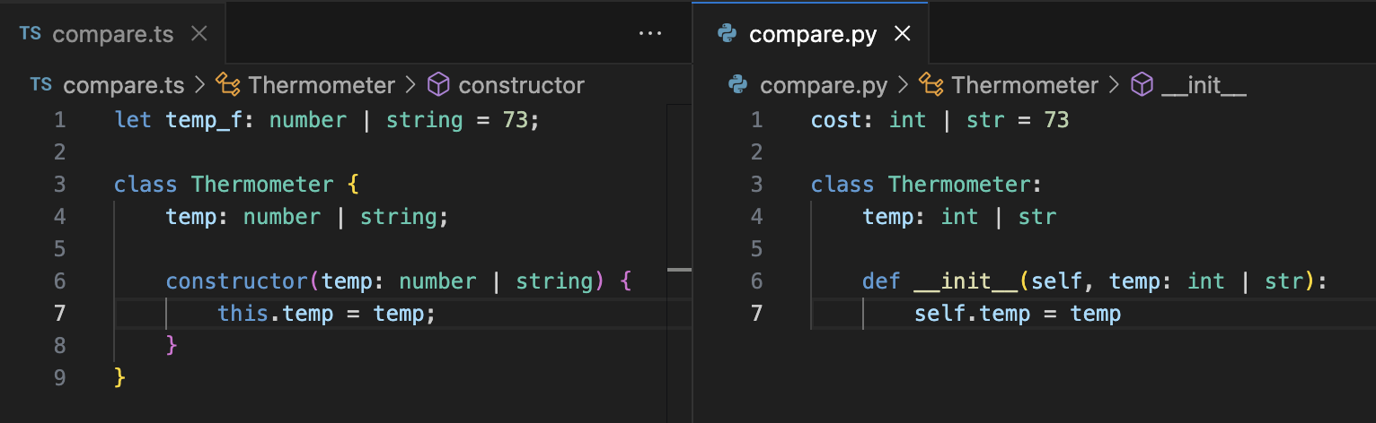 Learning a new programming language is much like learning a new, well, language, language. I’ve recently started learning Typescript, which in many ways reminds me of Python, particularly when it is statically-typed. In the same way, when I was learning Japanese, many things reminded me of Chinese, such as the numbers (both in the way they’re written and the way they’re pronounced) and the Kanji. There are definitely historical reasons for this, just like there are probably historical reasons for Python and Typescript sharing similarities. In both Python and Typescript, types can be specified using this “variable: type” syntax, with support for unionizing the types. Additionally, both languages allow for object-oriented programming. As for their differences, Python uses whitespace to determine code blocks whereas Typescript uses curly braces. Typescript uses the less specific type “number” in contrast to Python’s “float” or “int”.