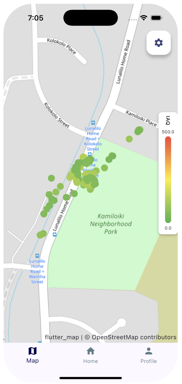 On the software side, I led development of the iOS mobile application using Flutter. The app connects to device nodes over BLE, visualizes sensor data through time-series plots and geographic heat maps, and stores data both locally and remotely. Local persistence was implemented using Drift, with periodic synchronization to a Supabase backend.
