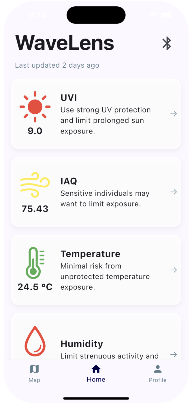 WaveLens is a portable environmental monitoring system designed to measure ultraviolet (UV) exposure, air quality, temperature, and humidity in real time. The motivation behind this project is the growing public health risk associated with prolonged exposure to UV radiation, poor air quality, and other extreme environmental conditions, particularly in outdoor settings. The system pairs a compact sensing device with a mobile application that enables real-time visualization and long-term data storage. Together, these components provide an accessible and affordable approach to environmental data collection that can support personal awareness and future public health decision-making.