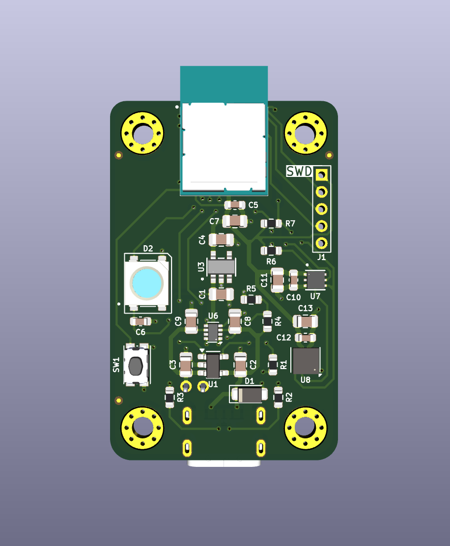 I served as both the electrical subsystem lead and software subsystem lead, overseeing the end-to-end design of the hardware and mobile application. On the hardware side, I designed a custom two-layer PCB featuring a Nordic BMD-340 system-on-module, a BME680 environmental sensor, and a LTR-390 UV sensor, all powered by a rechargeable lithium-ion battery with USB-C charging. I developed the device’s firmware using the nRF Connect SDK and Zephyr RTOS, with BME680 data acquisition handled through Bosch’s BSEC library.